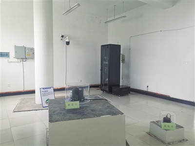 走进设备间和观测室,里面的设备也一览无遗:一个大柱子,直通房顶;两个大小不一的水泥墩子,上面安装着用玻璃罩罩着的仪器,上面只有连接线,没有显示屏;一个黑色冰箱一样的箱体,连接着许多电线电缆。墙上还有一个温湿度计,有监控摄像头,其他就是没啥特别的灯管和窗户了。