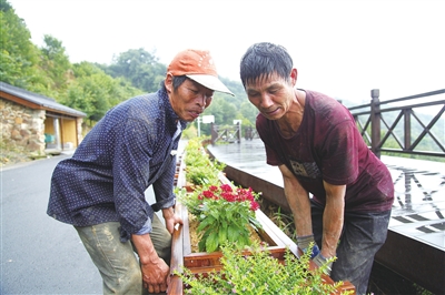 7月19日,施工人员正在小将镇尼姑岭观景平台边摆放花草,对该观景平台进行美化。据悉,尼姑岭观景平台也是竹海水韵景观带的一个重要节点。竹海水韵景观带北起沙溪镇王家年村,南到小将镇茅洋村,全长59公里,其中小将段长31.18公里,共涉及该镇茅洋、五埠、里家溪等10个村庄,在去年建起路廊、观景平台、停车场等设施的基础上,今年该镇又对沿途周边环境进行精心美化。 (记者 俞晓委 摄)