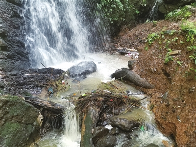 走到谷底,近看瀑布时,却让瀑布底下的杂物破坏了心情——这里搁积着不少杂物,有可乐瓶、矿泉水瓶、饮料盒、塑料泡沫板、枯枝、竹梢、杂草等,不一而足。与悬挂在半空中的白色的瀑布形成了强烈的对比。