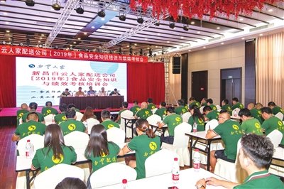 近日,新昌白云人家配送公司举行2019年食品安全知识与绩效考核培训会,邀请县市场监管局食品流通监督管理科工作人员作食品安全知识专题讲座。 (记者 俞臻 摄)