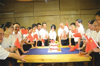9月9日晚,新昌民盟盟员们围着定制的生日蛋糕,手举五星红旗,深情欢呼“祖国母亲生日快乐”,表达不忘合作初心、继续携手前进的意愿,庆祝新中国成立70周年。 (记者 胡夏锋 摄)