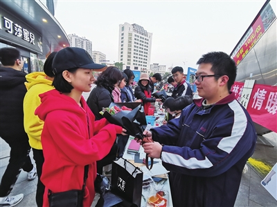 1月20日,新昌中学高二(3)班30多名学生在海洋城开展义卖活动。寒冷的冬日,学生们卖鲜花、水果、自制饼干、纸杯蛋糕等,还在现场挥毫泼墨暖心手写、自摄风景明信片、绘画、歌艺表演等,吸引了众多关注,许多人纷纷慷慨解囊。义卖共得1000多元,将用于八个贫困孩子书籍等学习用品的购买。 (记者 王娟敏 摄)