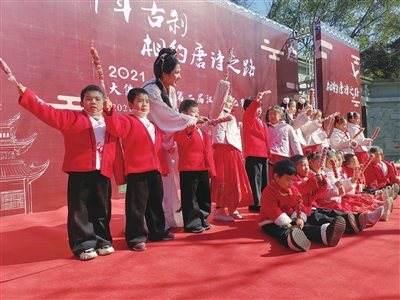 “呯呯嘭嘭,先生书房对面开糖坊,喷香喷香油麻糖,蜜甜花生糖,阴凉薄荷糖,刁宁刁宁(音)牛皮糖,还有卖糖矮子当当当当卖姜糖……”新年伊始,一群穿着汉服唐装的学龄前儿童,登上“穿越千年古刹 相约唐诗之路”大佛寺景区第二届汉服文化节舞台,用一首新昌话天姥童谣《卖糖歌》演绎时空穿越。清朗的童声伴着欢快的音乐回荡在佛心广场上空,赢得无数游客和本地市民的掌声。