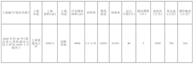 2020年经40号地块网上拍卖交易不设底价,增价幅度为100万元或100万元的整数倍,按照“价高者得”的原则确定竞得入选人。确定竞得入选人的具体要求以地块出让须知为准。