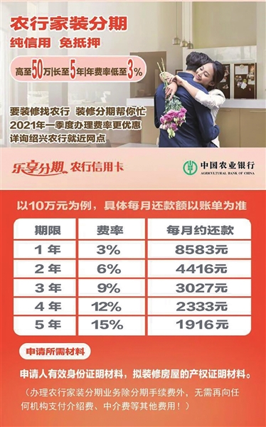 以10万元为例,具体每月还款额以账单为准 期限 费率 每月约还款 1年 3% 8583元 2年 6% 4416元 3年 9% 3027元 4年 12% 2333元 5年 15% 1916元 申请所需材料:申请人有效身份证明材料,拟装修房屋的产权证明材料。(办理农行家装分期业务除分期手续费外,无需再向任何机构支付介绍费、中介费等其他费用!)