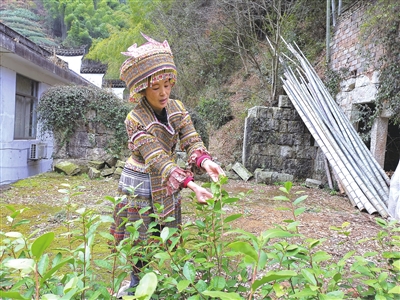 立春过后,天气慢慢暖和起来,几场春雨下过,茶园里渐次冒出星点嫩芽,赵进菊仔细查看每株茶树的生长情况,盘算着今年的春茶采摘计划:“估计再有半个月,茶芽就可以摘了,竹篓、茶机这些农具,要开始准备起来了。”赵进菊说,二十多年前初到外婆坑,她就开始跟着村里的姐妹们一起上山采茶,每年茶叶季,一家人都要没白没黑忙上几个月。从最初的茶锅炒茶,到如今的全自动茶机,大山里长出的“金叶子”逐渐改善了一家人的生活。