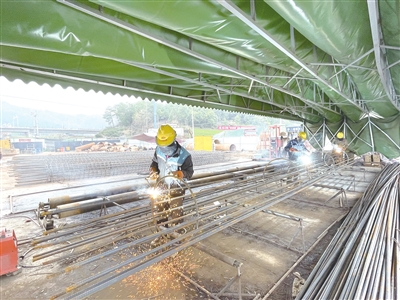 3月9日,在杭绍台铁路嵊州新昌站施工建设现场,运输车辆来回穿梭,吊机上下运送材料,施工人员正在开展钢筋笼焊接,现场一派忙碌景象。杭绍台铁路嵊州新昌站占地面积约2.5万平米,总投资约4.88亿元,目前已完成整体形象进度的50%,计划于7月底前全面完工。 (通讯员 徐云锋 摄)