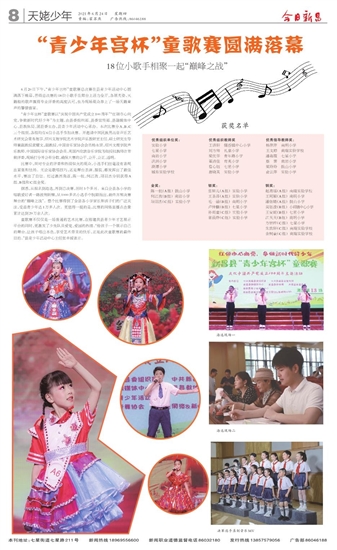 6月20日下午,“青少年宫杯”童歌赛总决赛在县青少年活动中心圆满落下帷幕,晋级总决赛的18位小歌手在舞台上活力全开,各展英姿,天籁般的歌声赢得专业评委的高度认可,也为现场观众奉上了一场天籁童声的饕餮盛宴。