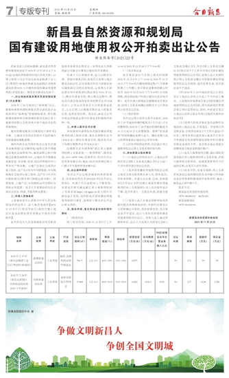 经新昌县人民政府批准,新昌县自然资源和规划局决定于2021年12月15日上午9:00起(各地块具体拍卖时间以系统为准),以网上拍卖方式公开出让新昌县梅渚工业小区(枣园村)D地块和新昌高新园区羽林街道初丝湾2021-1号地块的国有建设用地使用权(详见附表)。现将有关事项公告如下: 一、出让地块的基本情况及规划指标要求(详见表格) 2021年工24号地块以“标准地”出让,能耗标准和环境标准要求符合新昌县企业投资项目“标准地”控制指标要求,单位能耗增加值和单位排放增加值详见浙江省土地使用权网上交易系统中每个地块设定的具体指标。