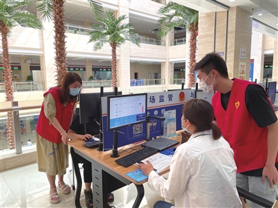 近日,县市场监督管理局持续深化“放管服”改革、优化营商环境,将便民助企工作与高校暑期社会实践活动有机结合,安排志愿者在窗口自助服务区提供导办、帮办、代办服务,真正让志愿者成为群众办事的好助手,进一步提升窗口效能,深化“贴心”服务,打造有活力、有温度、有效率的政务服务环境。 (通讯员 周菡潇 摄)
