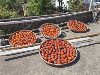 人气有了,新鲜柿子就不愁卖了。但村干部们却没有止步于此,他们又开始谋划着对柿子进行深加工,拓展产业链。去年开始,村妇联主席潘士平开始尝试用传统方式制作柿饼。这几天天气晴好,在潘士平家的阳台上,挂满了一串串削完皮的柿子,在阳光的照射下,红艳艳的果肉渐渐泛出糖霜,甜蜜的芬芳弥漫在空气里。“鲜柿子一斤2.5元-5元,晒成柿饼,一斤就能卖25元,价格翻了好几倍,效益提升了不少。”潘士平说,她做的柿饼采用了村里传统的加工方法,保留了柿子“小灯笼”的外形,比常见的扁柿饼吃口更糯更甜,销量也非常不错,目前已经预订出去一百多斤。“订单太多了,都来不及晒,我就又买了800根晒柿饼的架子,把我爸妈也喊来帮忙了。”潘士平笑着说。