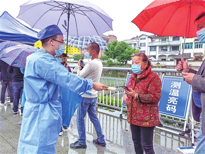 昨日中午,阴沉的天空飘着细雨,但在南明街道新东社区平川公园“愿检尽检”核酸检测点内却充满了温暖,新东社区的工作人员为没带雨伞、正在排队的市民们送上雨衣,帮助他们抵御雨水侵袭。