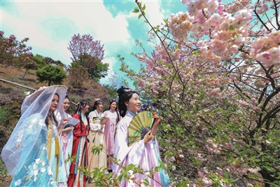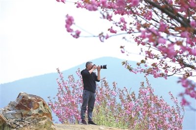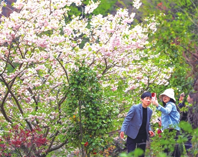 樱花林里,悄然盛开的樱花粉红喜人。不少游客漫步其中,一边欣赏樱花,一边用镜头记录下美丽的风景。