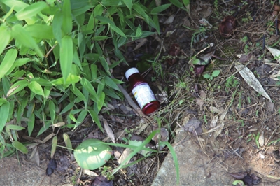 在山塘南岸的竹林中,记者看到了四五个农药瓶,其中一个内部还有农药残留。经过仔细查看,记者发现,被丢弃的农药瓶包装上,都标注了“水产养殖区、河塘等水体附近禁用”“禁止在河塘等水体中清洗施药器具”等注意事项,提醒使用者在施用农药时要避开河塘等水体。但事实上,这些农药瓶都被丢弃在山塘边。
