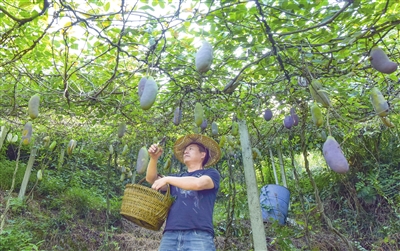 10月17日中午,在沙溪镇董村村生田自然村一基地果园内,果农正穿梭于藤蔓之下采收果实。只见翠绿的藤蔓下挂满了肥硕的八月瓜,有翠绿色、紫色、黄色,有的已经裂口,散发出淡淡清香,让人垂涎欲滴。据悉,今年该基地近30亩八月瓜旺产,实现产量、效益双丰收。 (记者 俞晓委 摄)