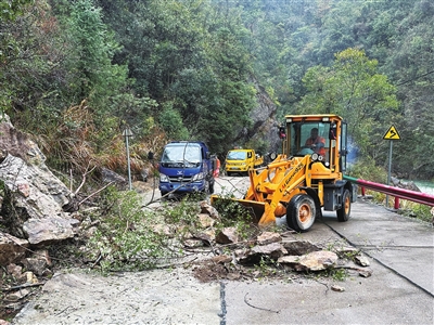 昨日,受持续降雨影响,新蟠线大坟山至方田坪路段发生高边坡塌方,山石掉落占据部分行车道,导致车辆无法正常通行,县公路部门立即组织人员进行抢险和清理作业。目前,道路已恢复通行。(记者 李帮焱 项泽统 摄)