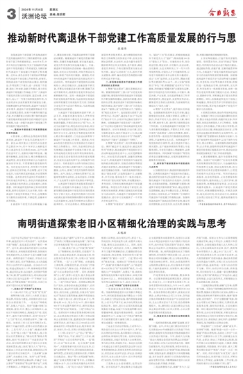 4.聚焦“养老需求”,提升组织关怀温度。全面摸底排查困难老党员实情,建立困难党员信息库,加强日常联系,定期上门探访,形成平时有人访、惑时有人解、难时有人帮、病时有人探、老时有人惦的常态化工作机制。扎实推进离退休干部党建工作与老年教育深度融合,开展形式多样、内容丰富的“思政课堂”,同时培育健身、摄影、孙辈养育等一批老党员们喜爱的优质特色课程,丰富精神文化生活。发挥离退休干部党组织的引领作用,成立离退休干部心理关爱队、老干部法律援助队等爱心为老服务团队,为老党员提供心理疏辅导、法律援助等服务。同时探索“时间银行”等互助式养老志愿服务做法,实现养老需求和志愿服务有效衔接。