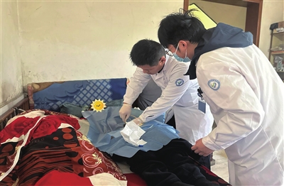 家庭医生潘涛接到提示后迅速响应,与县人民医院下沉专家吴海南医生一起,带上导尿包、药箱等专业医疗器具,即刻赶往倪大爷家中。问诊时,吴海南仔细询问老人的症状与体征,凭借丰富的临床经验,迅速判断情况,在简陋的居家环境中,按照操作要求,精准地为老人完成导尿管更换。操作完成后,家庭医生潘涛还耐心地向家属讲解日常护理注意事项,叮嘱家属后续注意观察导尿管引流情况,定期做好清洁护理,若出现异常及时通过家庭病床智慧平台联系医生。