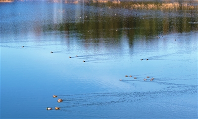 近日,记者在回山镇后坂水库惊喜地发现,成群的野生绿头鸭在此畅游嬉戏,为这片宁静的水域增添了盎然生机。