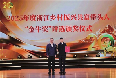 1月9日晚,常山剧院灯火璀璨,“金牛奔腾二十年,和美乡村看‘浙’里”2025年度浙江乡村振兴共富带头人“金牛奖”评选颁奖仪式隆重举行。当主持人念出“盛文斌”的名字时,这位来自新昌茶乡的汉子眼中泛起泪光。