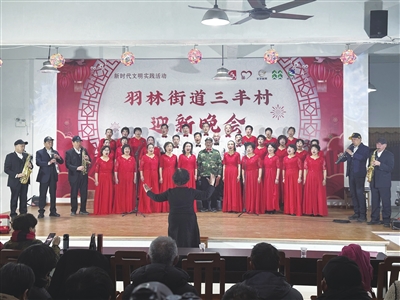 近日,2026年迎新春文艺晚会在羽林街道三丰村文化礼堂精彩上演。本场晚会的17个表演节目均由县同心公益演唱团编排、表演,京剧、越剧、舞蹈、歌曲等节目轮番上演,为村民送上了一台家门口的文化盛宴。 (记者 王宇洁 孟洲颉 摄)