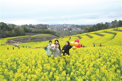 连日来,澄潭街道上湖村60余亩梯田油菜花竞相绽放,层层叠叠的金色花海随山势起伏,与远处村居相映成画。这片生态美景吸引县内外游客纷至沓来,大家徜徉其间赏花拍照,尽享田园野趣。