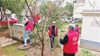 近日,梅湖社区文体党支部与新昌华数党支部开展文明城市共建活动。他们身穿红马甲,手持清洁工具,对小区内公共场所的卫生死角开展清理,让小区内的绿化带更翠绿、楼道更清洁,整体环境也更宜居。 (通讯员 吕鹏辉 摄)