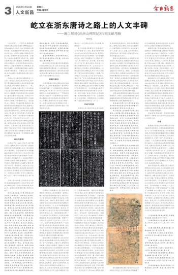 “贞石可凭”。一千多年来,散落在浙东唐诗之路上的金石遗存,默默地见证了这条诗路的历史变迁,是不可多得的文物和文献。地处唐越州剡中的沃洲山,为历史文化名山。东晋时,佛教大乘般若学在此兴起,为佛教中国化的发祥地。至唐代,大批诗人追慕晋贤,胜会于此。高僧白寂然来兹,得元稹襄助,兴建禅院,乞白居易为禅院记。白居易欣然垂文《沃洲山禅院记》,并邀刘禹锡书丹,珠联璧合,成数百年盛事。后因禅院屡兴屡废,名碑失而复得,得而复失。幸碑失文存,可证史迹,成为永远屹立在浙东唐诗之路上的人文丰碑。