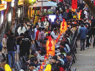 近日,“龙启南街 马踏春福”碳水长桌宴在南街碳水王国温情开席。现场,近150米长的龙形长桌宴上,蒸汤包、镬拉头、芋饺等新昌本地特色美食悉数登场,市民欢聚一堂共品烟火滋味,既弘扬传统民俗文化,也激活老街消费活力。(记者 夏炯炯 俞沣城 摄)