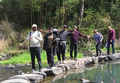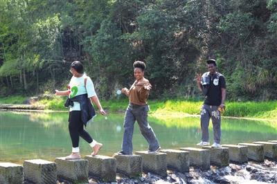 随后,大家沿着盐帮古道漫步,古道蜿蜒曲折,四周青山叠翠、溪水潺潺,水面波光粼粼,“一渡一景”的诗意景致让友人们流连忘返,纷纷拿出手机定格美景,真切体会“水清岸绿、河畅景美、水村相融”的乡村旅游新业态。“盐帮古道承载着古老的文化,而这片乡村又在焕发新的活力,既能保护好生态环境,又能让村民实现增收,这种共富发展模式非常棒,我会把在这里的所见所闻分享给身边的人,让更多人了解绍兴、了解新昌。”来自埃及的Taha对盐帮古道的历史底蕴和乡村的共富实践赞不绝口。