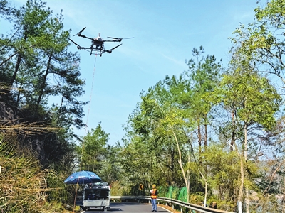 松材线虫病传播速度快、致死率高,对长诏水库库区林场的生态安全构成严重威胁。此前传统防治方法效率受限,疫木清运存在诸多不畅与难题。无人机技术的成功应用,彻底打破了这一防控瓶颈,为我县破解疫木防治难题、筑牢生态屏障提供了高效新方案。图为无人机在长诏水库库区林场开展疫木除治作业。